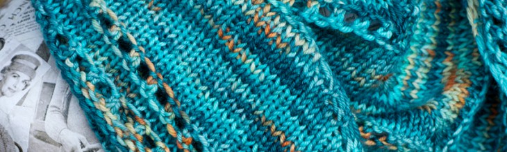 Then, because I was loving the color so much and wanted this to be more shawl/scarf like instead of kerchief like, I got another skein and made it longer. (I did an extra stockinette set and then a couple of stockinette sections between the last Garter/Eyelet section and the Final Section in Garter Stitch.)