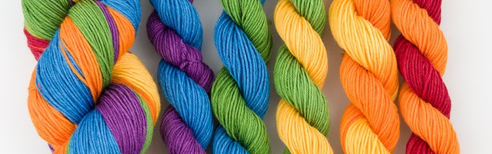 The Loopy Ewe Loopy Hues – This new line features coordinated mini skeins, each approximately 107 yards, for a total of 535 yards in the set. We have this in skeins that go from light to dark in one color, as well as in skeins that go from one color mix to another in steps. Fun to use for shawls, socks, hats, cowls and scarves! Fingering weight, 80% Superwash Merino and 20% Nylon. The skeins come wound up together in one big hank (as shown on the left), but we separated them out for the photos so you could see each one individually. Pattern ideas: Gradient Cowl, another Gradient Cowl, Gradient Mitts, Starry Night Gradient Scarf, Simple Gradient Hat, The Age of Brass and Steam Kerchief, Zuzu’s Petals, and Quaker Yarn Stretcher Boomerang.