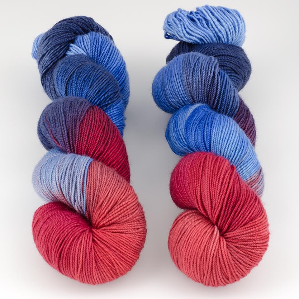 Blue Moon July Exclusive – This month, we have two of my favorite colors – denim blue and red. I used it to make a cowl, but I am also going to need socks out of this. And probably a hat and gloves. The colorway is called Sailing, but we also might have named it Casual Friday, Loopy Blues, or Favorite Jeans. I just love it.
