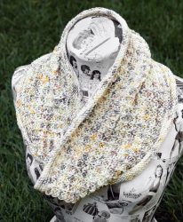 Blue Moon Fiber Arts August Exclusive – This one is call Purr-fection and it was dyed up based on my sweet Zoe cat (who is no longer with us). Tina, the dyer, proclaimed it her favorite color so far this year. Of course I was going to love it no matter what. But as I knit up the cowl, I became even more enamored with the color. The tan, grey and white background has tiny pops of green, yellow and pink and it works well for cowls, scarves, hats and sweaters. I also think it would make a wonderful baby blanket. The Knit Nighters frequently get a sneak peek of the next exclusive color, since I’m usually working on the sample there. I always know it’s a going to be good when several of them proclaim it a “must have”. 🙂 As always, we have it in the Socks that Rock base in Lightweight, Mediumweight and Heavyweight. I used a skein of the Heavyweight to make this Slipping Through the Cracks Cowl.