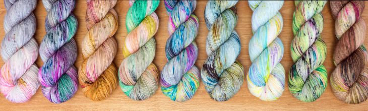 Another new indie dyer for us – Hue Loco! Nicole and her team do beautiful work in the dye studio. A bonus for us – her workshop is about 10 minutes from my house so I get to pick our order up in person. We are happy to add this Colorado-dyed line to our indie dyer lineup here at The Loopy Ewe. We have started with her Hue Loco Phyllis Sock base this time around.