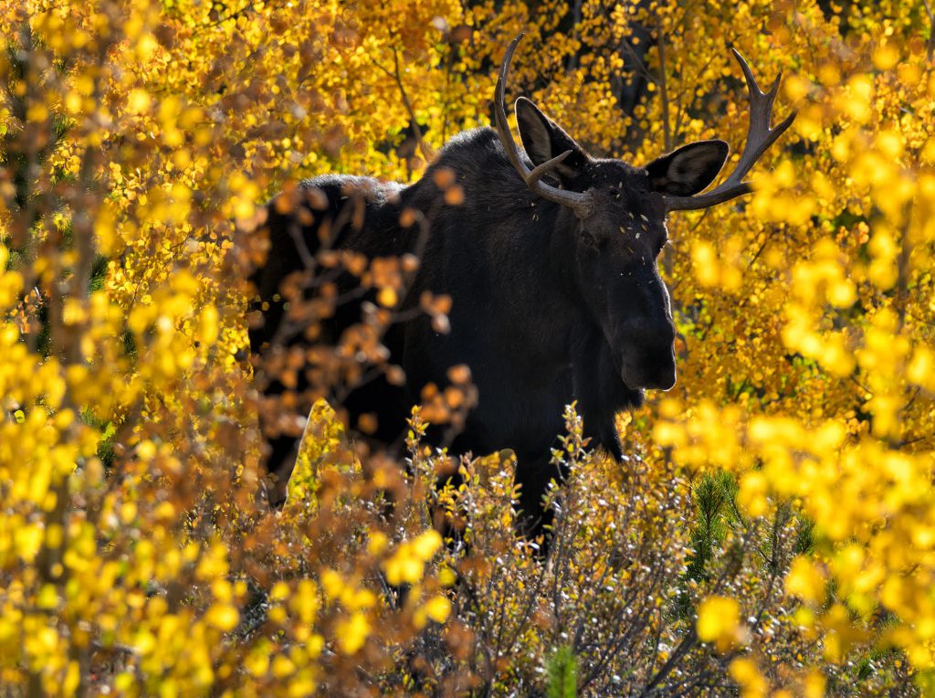 When you have a photographer in the family, fall is always a prime photo taking month. Paul was up in the mountains taking photos a couple of weeks ago. Getting some shots in an aspen grove, he heard a noise behind him. He turned around and saw this guy. (I’m thinking the moose was eating, based on the leaves scattered on his nose. Click on the photo to make it bigger.)